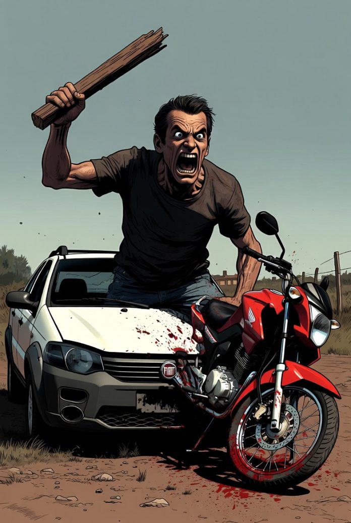 Ainda segundo o relato, o suspeito, utilizando um facão, cortou os pneus de uma motocicleta Honda Fan de cor vermelha pertencente à vítima. Em seguida, ele se dirigiu até a residência do comunicante, onde estava estacionado um veículo Fiat Strada, e passou a desferir vários golpes com um pedaço de madeira contra os vidros, deixando o automóvel completamente danificado.