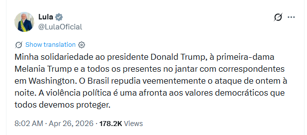 Em manifestação pública, Lula também estendeu apoio à primeira-dama Melania Trump e aos demais presentes no evento. O presidente brasileiro afirmou que “o Brasil repudia veementemente o ataque” e classificou a violência política como uma afronta aos valores democráticos.